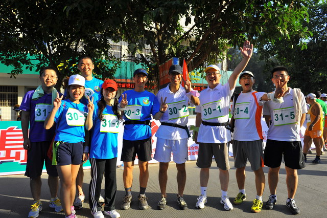 11月5日,秋陽燦爛,大家早已躍躍欲試,隊(duì)中負(fù)責(zé)后勤的我,早在比賽前夕就廣發(fā)注意帖:速干短褲、帽子、腰包、水杯、小方巾、鞋子等物品需必備;作為隊(duì)伍領(lǐng)頭雁的齊總則早已咨詢專業(yè)選手,提倡大家結(jié)合自己體力準(zhǔn)備能量棒、巧克力等緊急能量品;隊(duì)長鄧總在了解路線和路況后,制定了“穩(wěn)重取勝”的戰(zhàn)略,采取了“準(zhǔn)備活動(dòng)做充足,先慢后快求適應(yīng),不因外因亂陣腳,敵疲我追求成績”的具體戰(zhàn)術(shù);隊(duì)伍中的另一名隊(duì)員則帶來了他專業(yè)的GPS定位手表,分時(shí)段匯報(bào)所走路程、當(dāng)前速度適當(dāng)與否,并提前告知提速準(zhǔn)備;我們的女隊(duì)友亞梅,則一路保持微笑,緊跟隊(duì)伍,偶爾爆出的一些冷笑話,讓緊張趕路的我們倍感清爽。