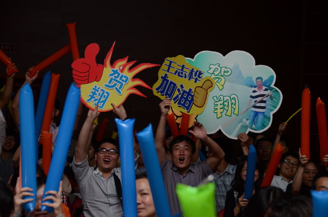 在激揚的歌曲聯(lián)唱《五月的花?!分校璩荣愓介_始。16名選手按組別輪流登場,現(xiàn)場精彩萬分。歌聲或激蕩高昂,或宛轉(zhuǎn)悠揚,或徐徐如風,或渾厚有力;表現(xiàn)力或動感十足,或動靜相宜,或幽靜宜人;曲風各異,或熱辣奔放,或溫暖抒情,或自然歡快,或懷舊悠揚。啦啦隊陣容也不容小覷,加油牌、口哨、熒光棒一應(yīng)俱全,或歌唱伊始吶喊助威,或伴隨著歌聲興奮地揮舞著手臂,更有甚者激動地走到臺上為選手喝彩,臺上臺下照相印襯、融為一體。期間,軍企拉歌、擊鼓傳花等活動環(huán)節(jié)也將比賽推向一個又一個高潮。
