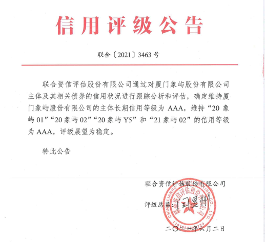 6月2日,權(quán)威評級機(jī)構(gòu)聯(lián)合資信評估股份有限公司(以下簡稱“聯(lián)合資信”)出具《廈門象嶼股份有限公司公開發(fā)行公司債券2021年跟蹤評級報(bào)告》,維持